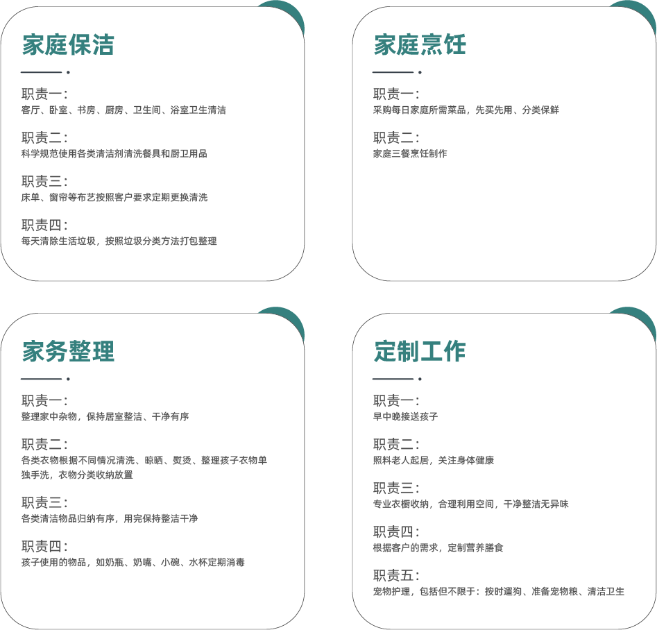 家庭保洁、家庭烹饪、家务整理、其他定制家政工作